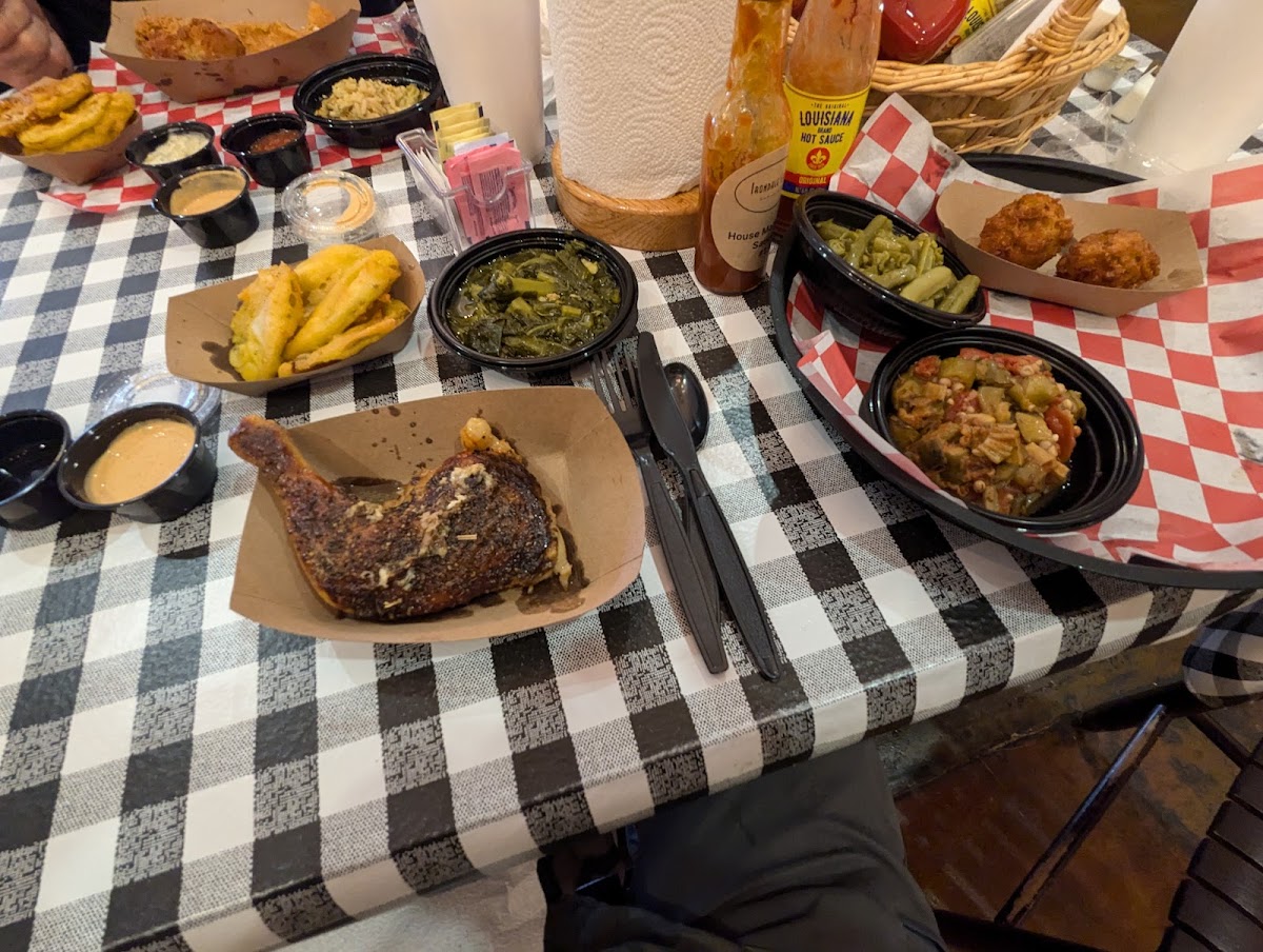 Quite the unexpected hidden gem that I happened upon while waiting for trains to clear track. Totally taken by surprise at the value and overall deliciousness of the food served here. Southern themed food with just the right amount of spice and flavor, I will totally be visiting here again! Generous portions and not too hard on your pocket, I highly recommend a trip here. The fried chicken and okra were amazing, both fried to perfection and not cooked too hard. And the macaroni and cheese was delectable as well, I give this establishment a certified 5 out of 5!